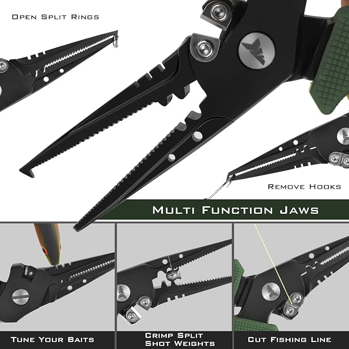 - Multi-Function Jaws – Grab and remove any fishhook with the serrated jaws or take advantage of the crimping slots to secure a split shot weight or build a steel leader. To cinch down a knot quickly and safely, insert your hook into one of the holes in the jaws and pull on your hook to create a tight knot. Available in both a straight nose and a split ring nose design.