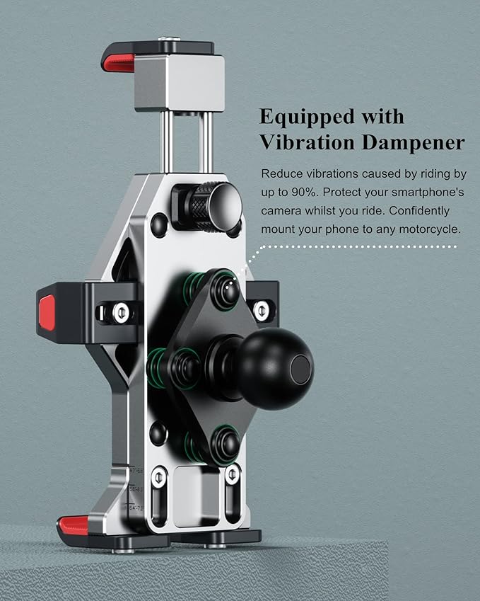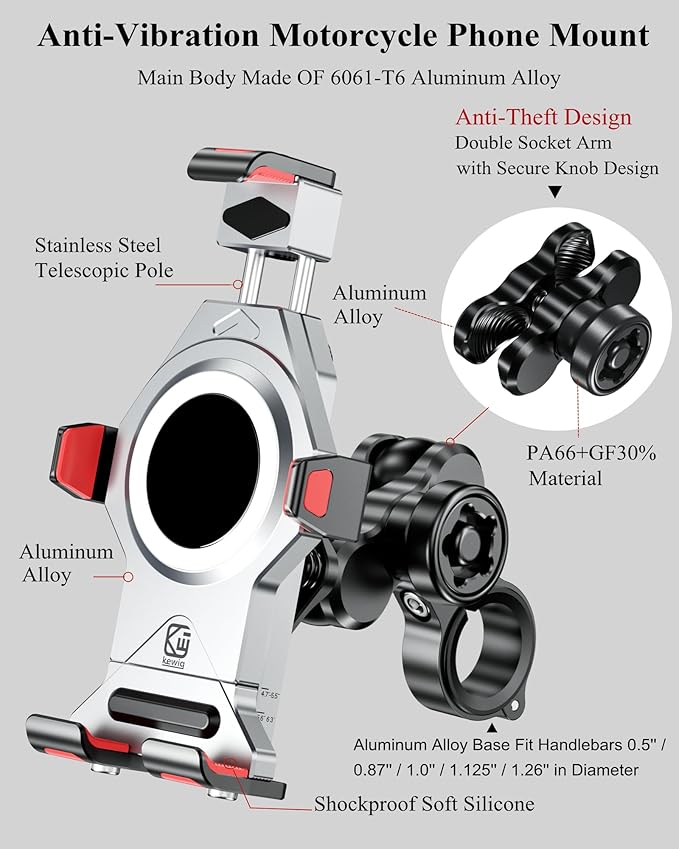 - Sturdy and Secure: Main body made of 6061-T6 aluminum alloy. This motorcycle phone mount equipped with vibration dampener. Adopts aluminum alloy handlebar mounting base & double socket arm. The double socket arm is designed with special safety knob. The package comes with a special wrench to tighten the safety knob. This design keeps your phone holder from being easily removed