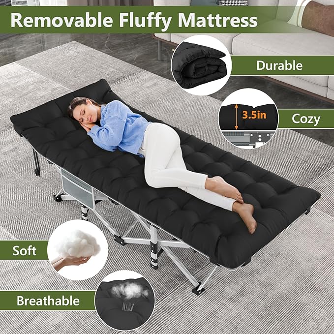 Slendor Folding Camping Cot Black, Sleeping Cot for Adults with Carry Bag, Mattress, 1200D Layer Oxford Portable Camp Bed Cot Bed for Guest Travel Office Beach