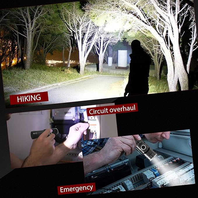 - WATER RESISTANT & ANTI-SLIP: IPX4 water proof lever to make it normal use when it’s raining. Anti slip aluminum body resists scratching and hard enough in tough environment, can be used as a camping flashlight, emergency flashlight, hiking flashlight, work flashlight, travel flashlight, etc.