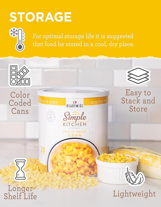 - ESSENTIAL EMERGENCY FOOD: When disaster strikes, you can rely on our READYWISE Simple Kitchen Freeze-Dried Corn. Crafted to meet your critical needs, these gluten-free, freeze-dried corn provide essential sustenance during crises.