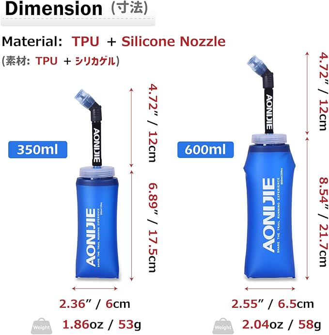 - Ultra-light: The 350ml runner's handheld flask with straw weighs only 1.86oz, and the 600ml water bottle with straw weighs just 2.04oz. You can store the collapsible flask in the fridge for cool drinks. Recommended usage temperature: 0°C-40°C / 32°F-104°F
