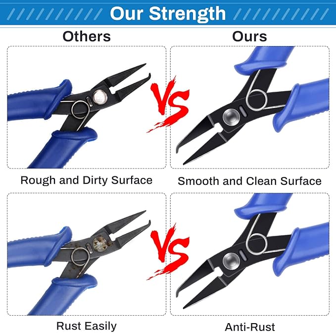 - With Protect Caps: Each jump ring pliers is equipped with a plastic cover on the jaws to prevent the split ring pliers from scratching. Our split ring tool openers are coated with a black oxide coating to enhance corrosion resistance. Anti-rust oil may appear on the jump ring tool, but it will not affect its function