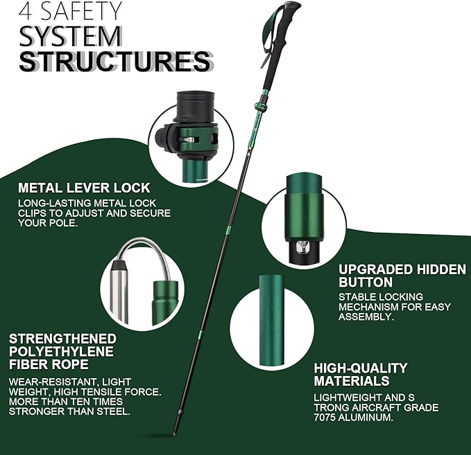 - Durable and Worry-free: TheFitLife hiking poles are made of lightweight 7075 aluminum alloy which is commonly used in aviation. It withstands pressure and shock better, in addition, it helps reduce back and knee joint stress. Metal lever lock and hidden button locking mechanism make it stable and secure