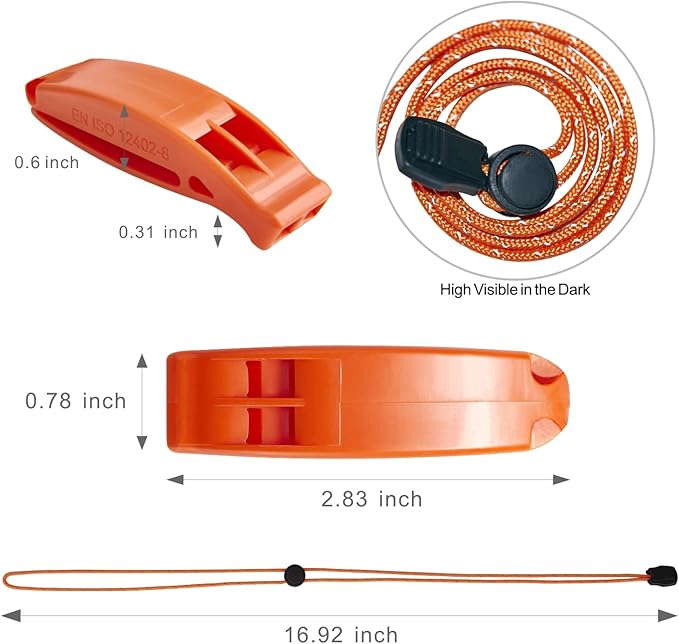 - Emergency Whistle 3pcs with lanyard: It includes two three-sound-chamber emergency whistles and one plastic survival whistle. Both can produce loud attention-grabbing sound up to about 120db, enough to call for help from a long distance and work great as signal whistle.