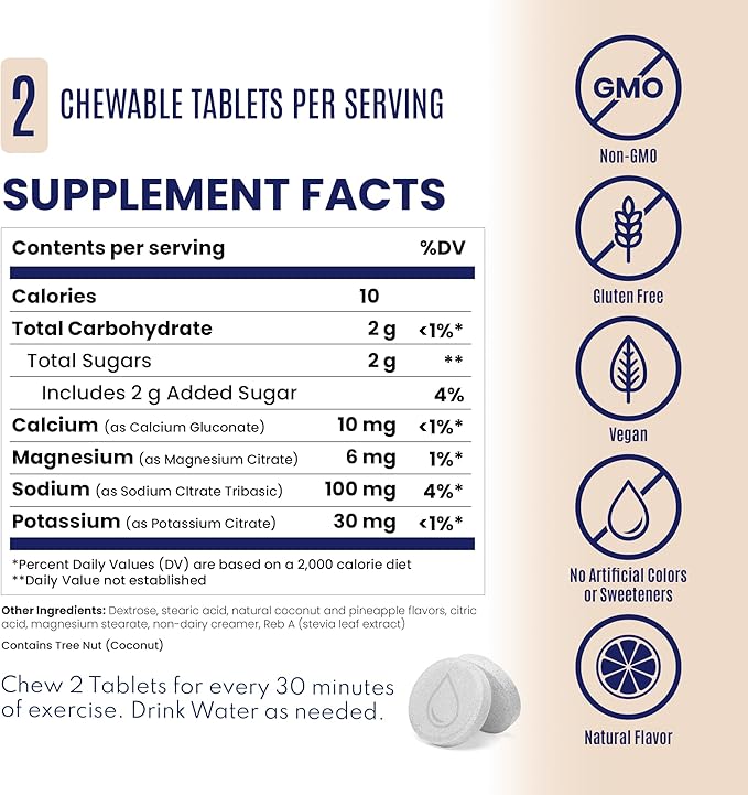 - CHEWABLE ELECTROLYTE TABLETS: Delicious and chewable bite-sized electrolyte tablets packed with sodium, potassium, calcium, and magnesium: the main electrolytes lost through sweat.