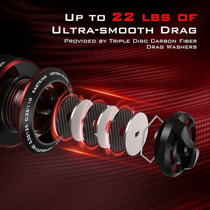 - Triple Disc Carbon Drag – The new KastKing Royale Legend Glory spinning reel has a three-layer carbon fiber disc drag system that gives you the smoothest drag possible for using light fishing lines and leaders. With up to 22 lbs of stopping power, you’ll always be in control.