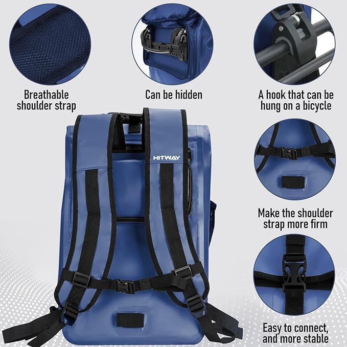 - 🎃Brilliant waterproof material:HITWAY Trunk Pack Bag is designed with the highest quality PVC material and 100% seamless waterproof zipper, which is tear-resistant, abrasion-resistant and heat-resistant, which can perfectly protect your items. Make sure you can use your bike bag in rain, snow or wet weather without hesitating your valuables getting wet inside. You don't even need to worry about muddy roads getting your bag dirty, because just wipe it down with a damp cloth.