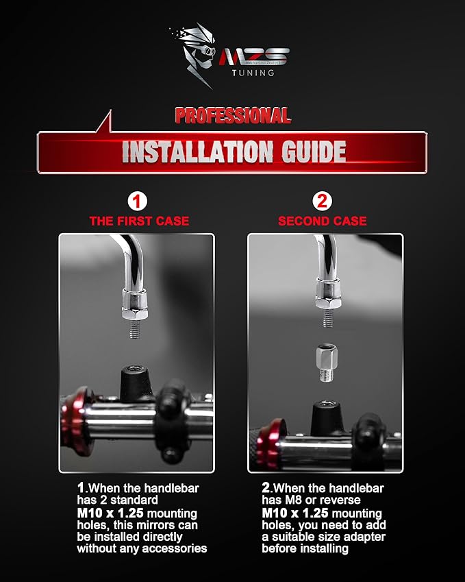 - Fitment - Universal motorcycle mirrors chrome 10mm 8mm ( 2 x 8mm Standard Adapter, 2 x 10mm Standard Adapter, 2 x 10mm Reverse Adapter, Not fit 10mm X 1.5 screw) suitable for Street Dirt Bike Cruiser Chopper Touring Scooter ect