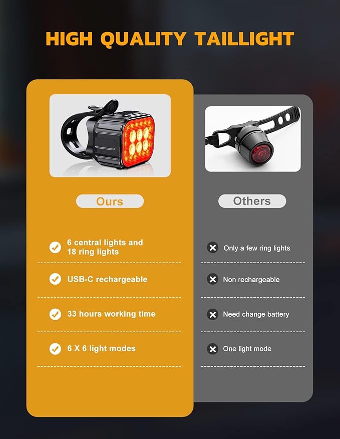 - Multi Modes & Extremely Bright - Adopted extra-large light beads, our bicycle lights provide 500 lumens of super bright illumination. Designed with two independent light controls, it can be configured for 4X4 (headlight) + 6X6 (rear light) various independent modes, including high, medium, low, and several flash modes.