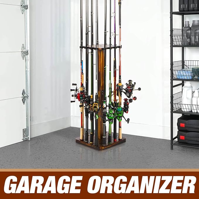 - Smooth 360 Rotation for Easy Access: The fishing rod holder can smoothly spin 360 degree with no stops. Turn the fishing pole holder left or right, you can always get what you want quickly. Get this beautifully crafted spinning wood fishing pole rack for space-efficient storage in your garages, basements, cabins or home. This fishing rod rack is also a great retail display in a fishing tackle shop!