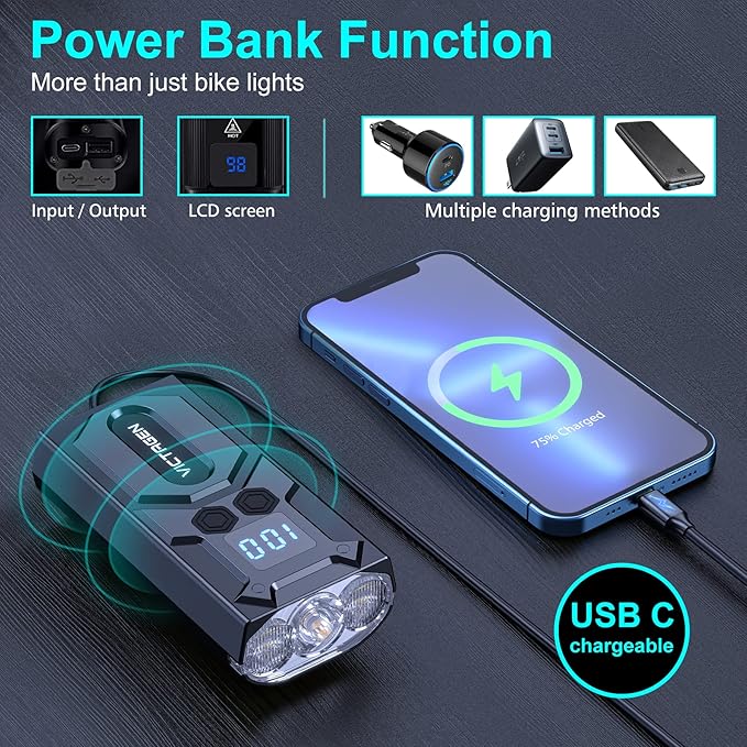 - 【Bike Lights & Power Bank】Type-C Rechargeable bicycle light, bike light with USB output power bank function, you can light up and charge your phone at the same time