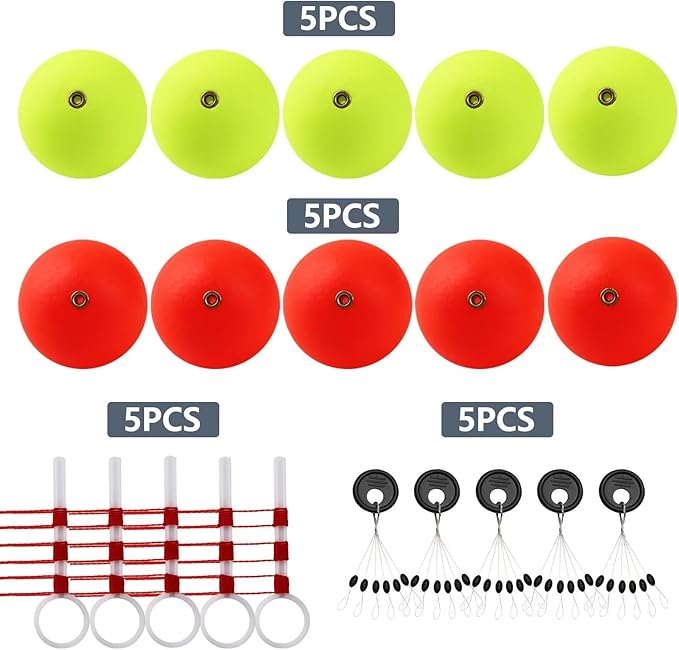 - Package Contend: There are 5 sizes you can choose. Each set including 10pcs fish floats(5pcs red and 5pcs yellow). 5pcs fishing bobber stopper and 5pcs stop knots. Total 20pcs products. A great set of accessories for slip fishing rig.