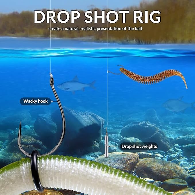 - EFFECTIVE DROP SHOT RIG : A drop shot rig allows the bait to hover over the bottom and create a very natural, realistic presentation,as everyone knows. Drop shot weights are designed for drop shot fishing. The slender drop shot weights can be entered quietly when casting. Work great and come through rocks and wood without snagging easily. Simply to use and effective. Make drop-shotting fun and easy.