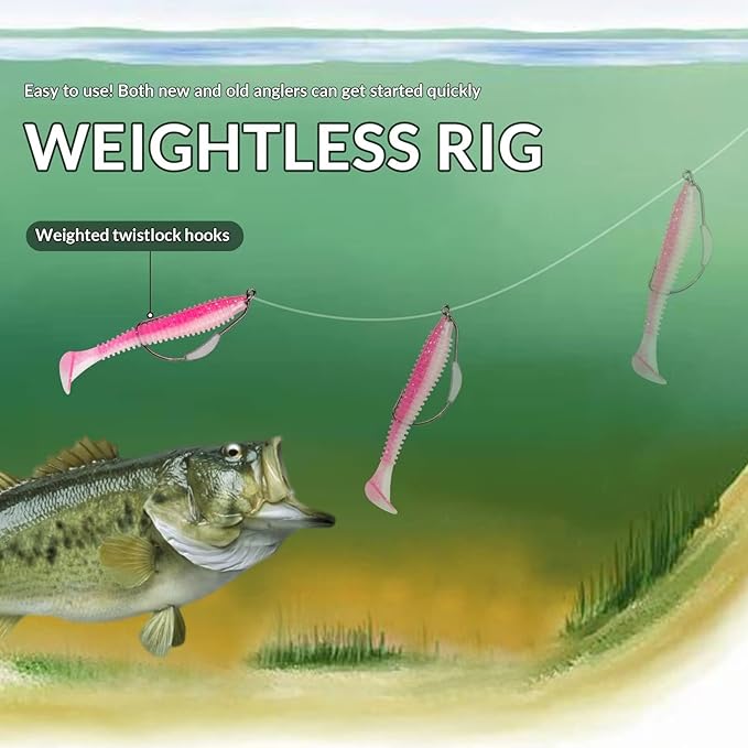 - EFFICIENT WEIGHTLESS RIG: Weightless rigs are a more natural, relaxing, and efficient option for bass fishing. By not using a weight on your rig, you can change the appearance and presentation of your tackle and bait to become more appealing to bass. Particularly in shallow water.The weighted hook with twist lock is an excellent choice for it. The twistlock plays the role of firmly fixing the bait.The immovable weight on the weighted hook helps to increase the throwing distance.