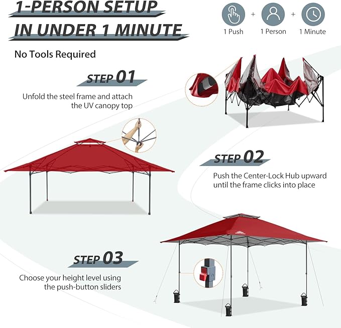 - EASY SETUP: This easy setup pop up canopy tent features the Peak Push system, a patented canopy center lock. The portable canopy requires no tools and easily opens and closes from the center in seconds. Its unique canopy tent center lock enables a quick, one person setup, letting you maximize outdoor time with minimal effort