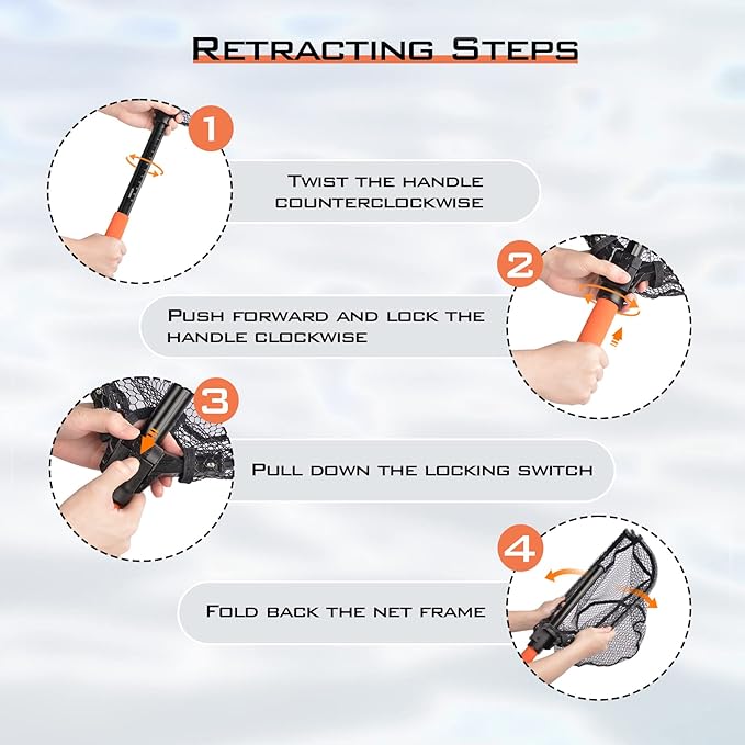 - Bright Color EVA Handle:The bright orange EVA foam handle allows you quickly find the landing net in just a few seconds, even in low light conditions. And this comfortable EVA handle provides a firm handgrip and makes the handle much easier to hold without slipping when your hand is wet or in cold weather.