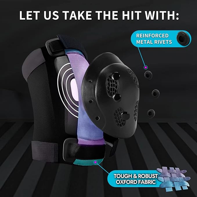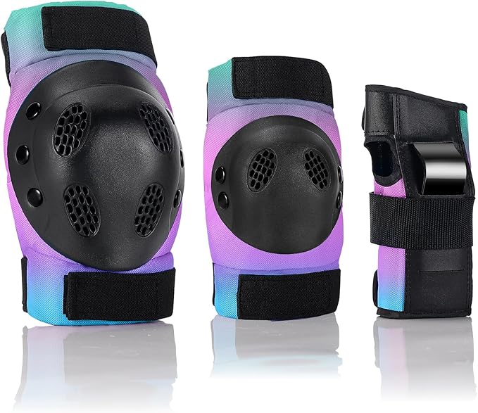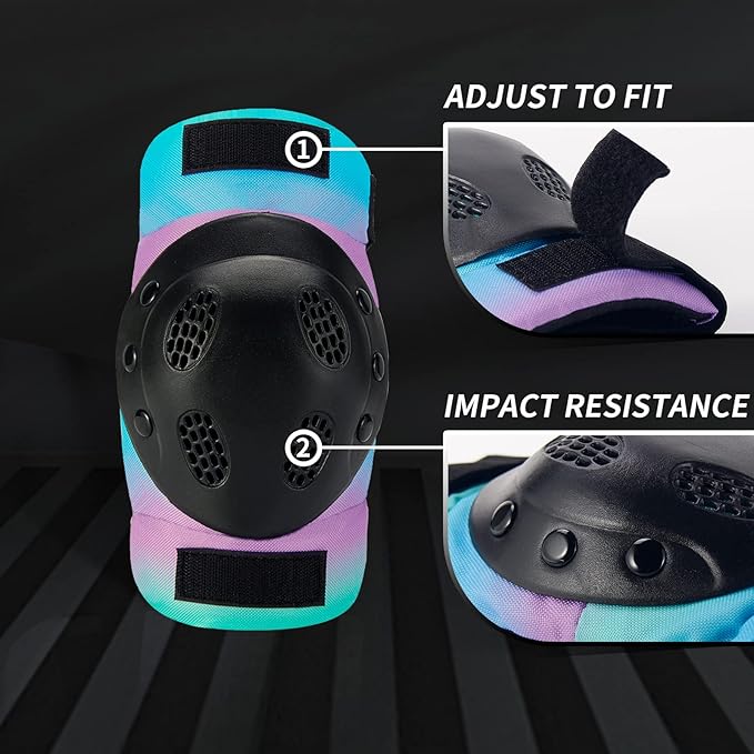 - 【UNIQUE COLOR GRADIENT& PREMIUM PADDING SET】 Unique Design Color Gradient .You become the best sparkle with it.2pcs knee pads, 2pcs elbow pads,2pcs wrist guards,Use size Size Suggest: S suggest for 3-6 year old, M suggest for 7-14 ,L suggest for 15-18Youth