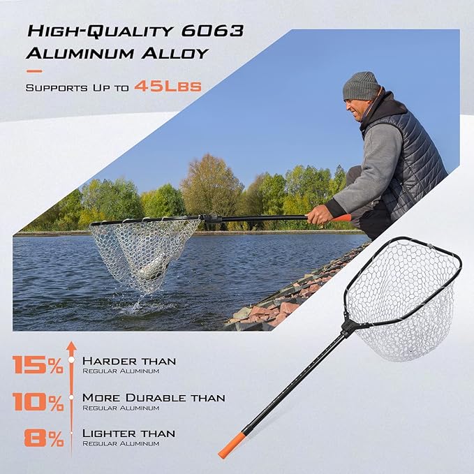 - Environment Friendly & Stealth Design: Specially designed with two different fishing net choices: nylon covered PVC or, silicone. These quality materials guarantee snag and tangle-free performance. Especially the soft silicone material that is fish-friendly so that it reduces harm to fish if you are planning to release your catch. That is a perfect choice for avid anglers practicing catch and release. The clear rubberized nets won’t spook the fish during the landing process.