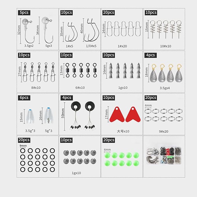 - 145pcs Fishing Accessories Kit including Round Jig Heads, Offset Worm Hooks, Bullet Weights, Round Split Shot, Fishing Snaps, Fishing Swivels, Fishing Beads。