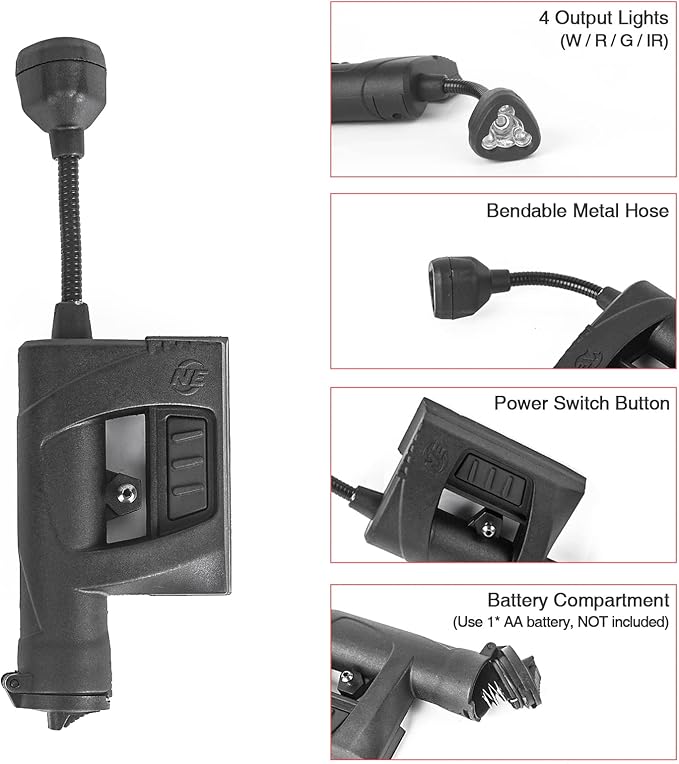 - [Bendable Lamp Neck] - Designed with flexible bendable metal hose, can be adjusted the light illumination angle arbitrarily according to tactical needs