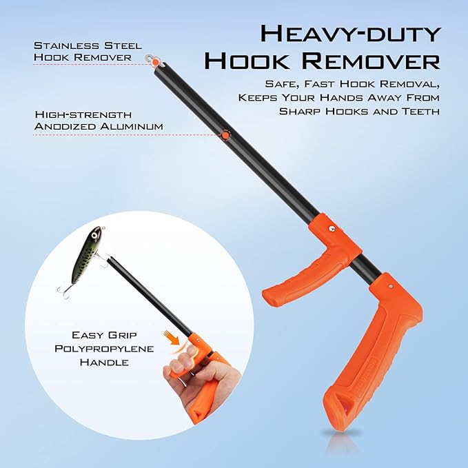 - Durable Accessories: The KastKing hook remover is constructed of anodized aluminum with stainless steel interior for ultimate strength. It performs well, is safer and faster in removing hooks. Do less harm to the fish, while protecting your hands. The durable forced nylon material lip grip securely grips the fish and the no-puncture design will not harm fish while holding it firmly in place for release, photos or for checking weight.