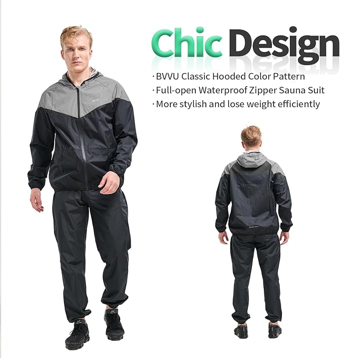 - Functional Sauna Jacket: BVVU male sauna suit has the full open waterproof zipper,the sweat jacket comes with excellent heat-trapping function. This training suit for men has hood, easy to wear in daily life.The BVVU logo printed close cuff can lock the heat more effectively.Windproof and waterproof, not only can maintains body temperature, but also can accelerates sweating and wear for all seasons.