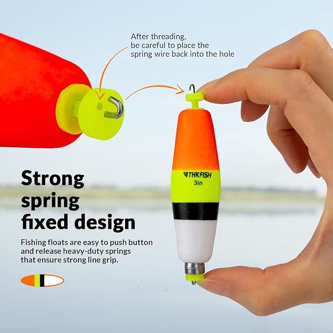 - EASY TO USE:There are spring butons on the up and dowm of the float body.Fishing floats are easy to push button and release heavy-duty springs that ensure strong line grip.