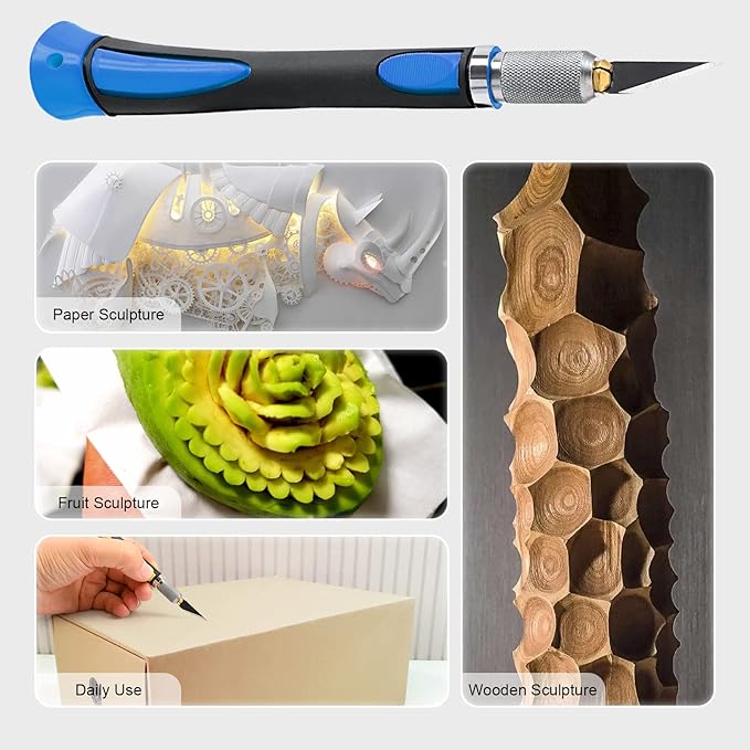 - Sturdy Hobby Knife: The craft knife handle is made of soft rubber and ABS plastic, which is durable and long-lasting. It has a good design with beefy handle and soft rubber sleeve to help with precision work.