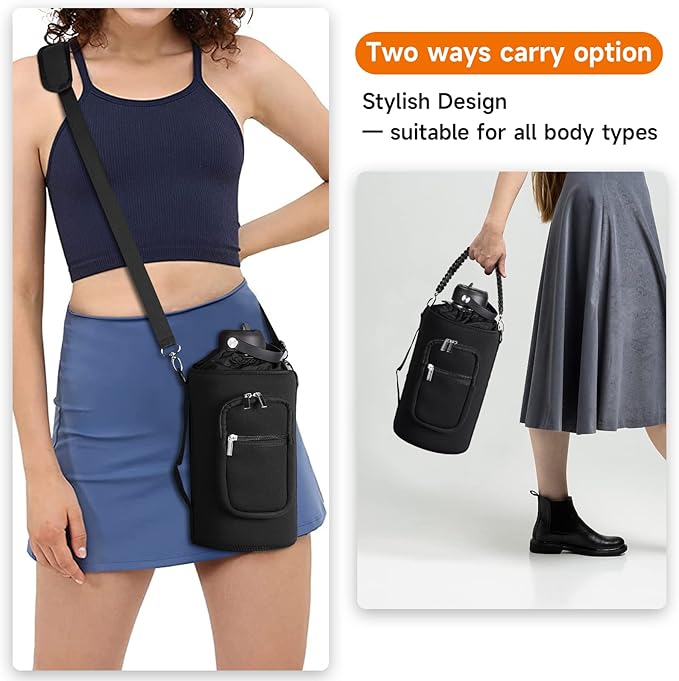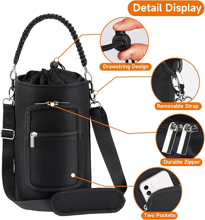 32/40/64/128 oz Neoprene Insulated Water Bottle Carrier Bag, Sling Bag Sleeve Pouch Holder with Strap & Paracord Handle and 2 Pocket for Travelling, Hiking, Camping