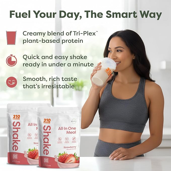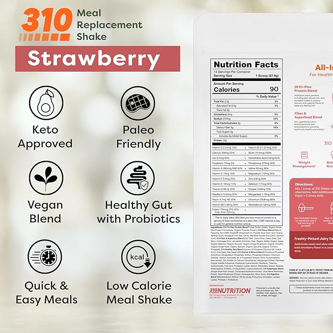 310 Nutrition All-In-One Meal Replacement Shake Powder - Plant-Based Protein Smoothie Blend w/High Fiber, Probiotics & Adaptogens - Low Carb, Vegan, Keto & Paleo Friendly - Strawberry - 14 Srv