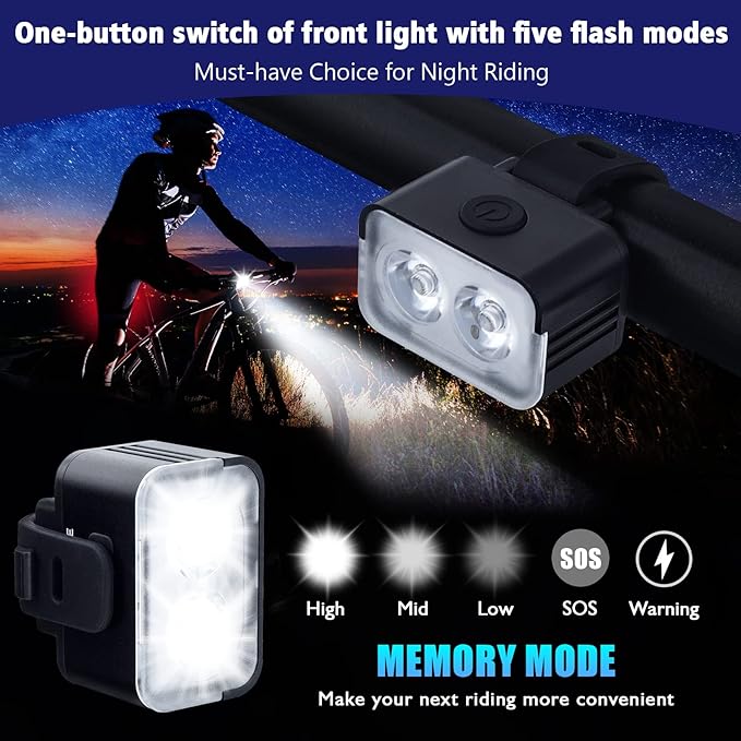 - Ultra Bright LED and Multiple Modes - This bike light set uses LED lamp beads to provide super bright lighting. Each light has one switch button for all modes . Front headlights 5 modes + Rear taillights 6 modes, high brightness, medium brightness, low brightness, SOS, warning flash modes, very convenient for you to switch freely.
