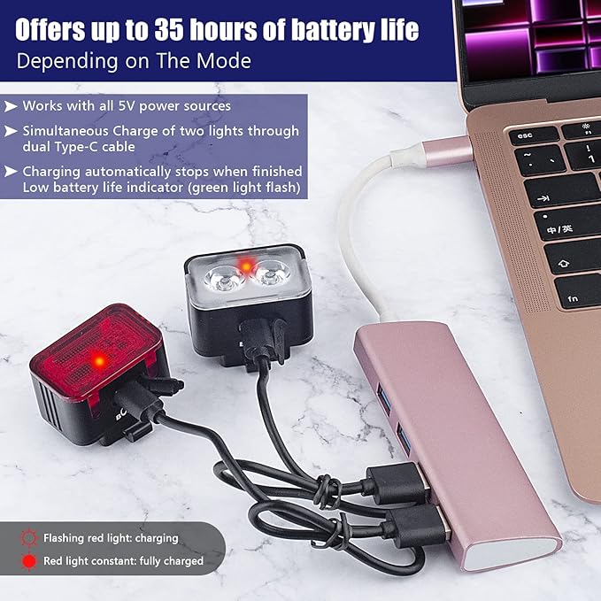 - USB Rechargeable & Long Run-Time: This Bobilife bike headlight and taillight for night riding have two fast USB-C for full charged at the same time. and the bicycle lights with amazing long run time for 3+ hours on high mode & and run up to 35 hours in the low light mode.