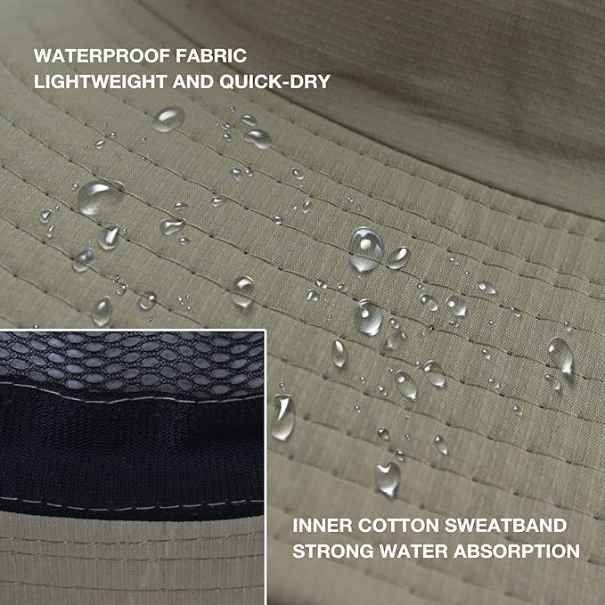 - PREMIUM QUALITY ADJUSTABLE: Men's sun hat is made of high quality polyester, water repellent nylon fiber, lightweight, quick drying, and water resistant. One size fits men's head circumference of 22-23.6 inches. Adjustable chin strap keeps the fishing hat on your head even in windy day protecting from losing.