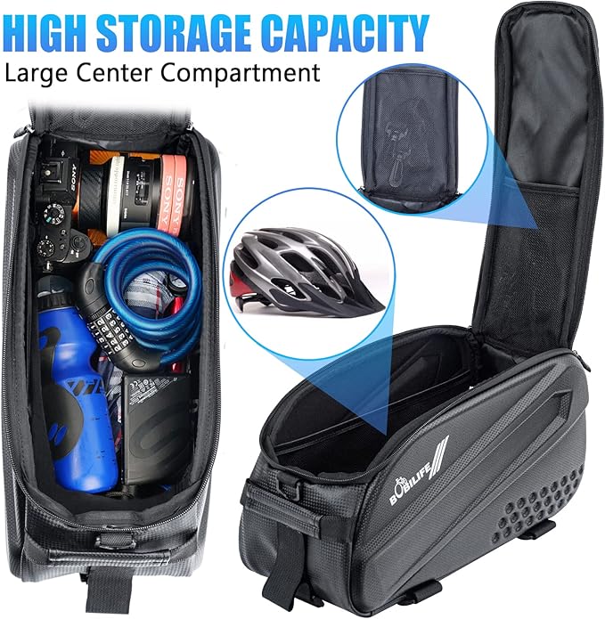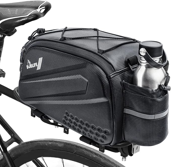- Large Capacity: The BOBILIFE bike rear rack trunk bag has roomy interior can hold many stuff, such as cycling tools, camera, helmet, shoes and water bottle.