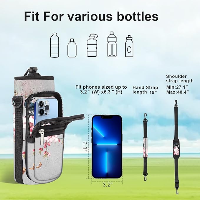 - 【Size】: Our AORTDES water bottle crossbody bag has 4 sizes to choose. 25oz (Max Bottle Diameter 8.2cm ≈ 3.23", Height 23cm ≈ 9.05", Pockets Size 7.48" x 3.93" x 1.57"). 32oz (Max Bottle Diameter 9.7cm ≈ 3.82", Height 20cm ≈ 7.87", Pockets Size 7.48" x 3.93" x 1.57"). 40oz (Max Bottle Diameter 9.7cm ≈ 3.82", Height 23cm ≈ 9.05", Pockets Size 7.48" x 3.93" x 1.57"). 64oz (Max Bottle Diameter 13cm ≈ 5.12", Height 23cm ≈ 9.05", Pockets Size 7.48" x 3.93" x 1.57").