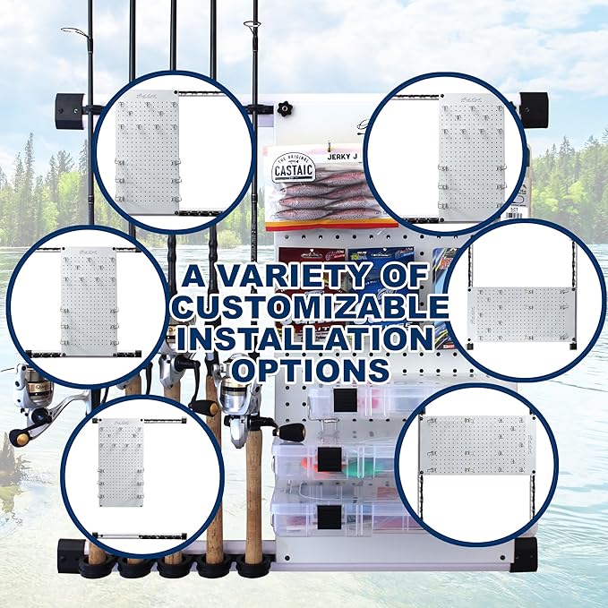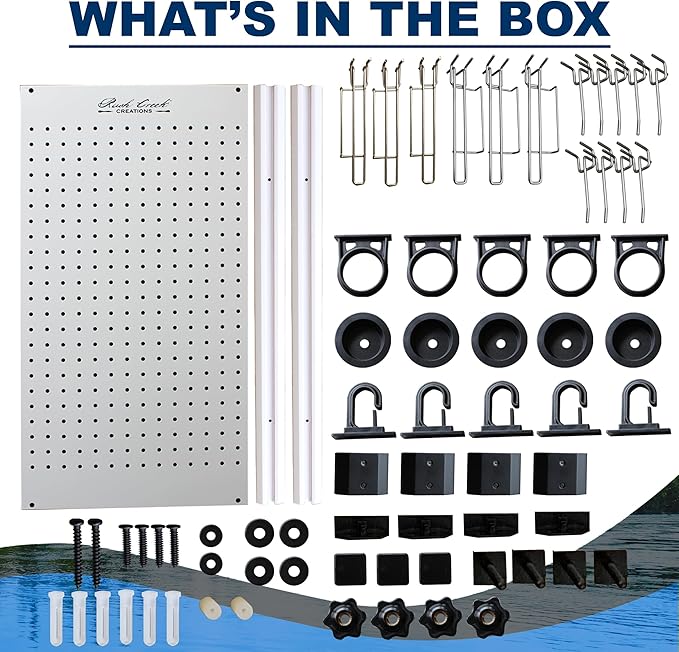 - QUALITY COMPONENTS: The heavy-duty metal pegboard measure 27.5” x 14.75” and have a powder-coated smooth white durable finish. All “U” clips and pegs are chrome-plated with a high-luster finish to resist corrosion. The fishing rod holder features a sliding track so you can customize 5 rod and reel combos in various positions. The “J” clips lock in the rods with oversized deep rod handle wells to prevent your gear from becoming damaged