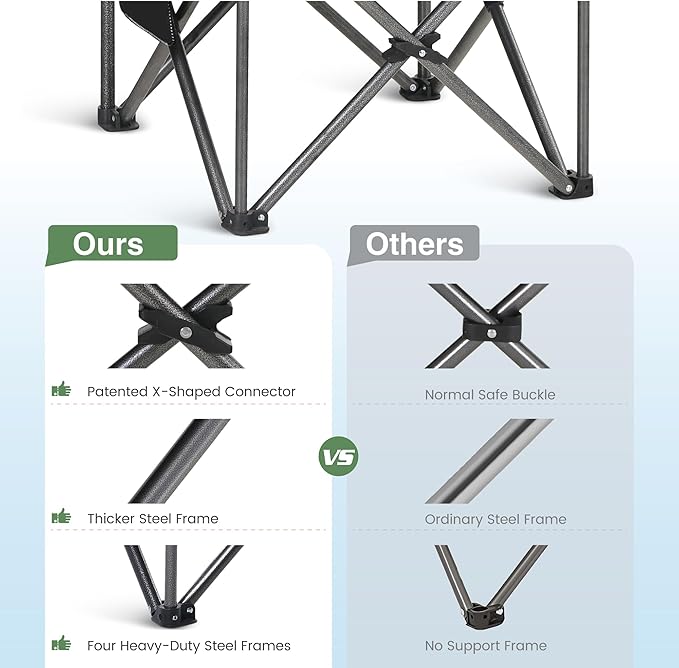 - Sturdy Material: This lawn camping chair for adults has hammer tone powder coating that can prevent corrosion and fading. Four heavy-duty steel frame was added to the bottom of the chair and enforce stability. Sturdy steel frame construction make it can support up to 450lbs/200kg.The 600D Oxford fabric is resistant to tears and abrasions, ensuring that this chair will last for years to come