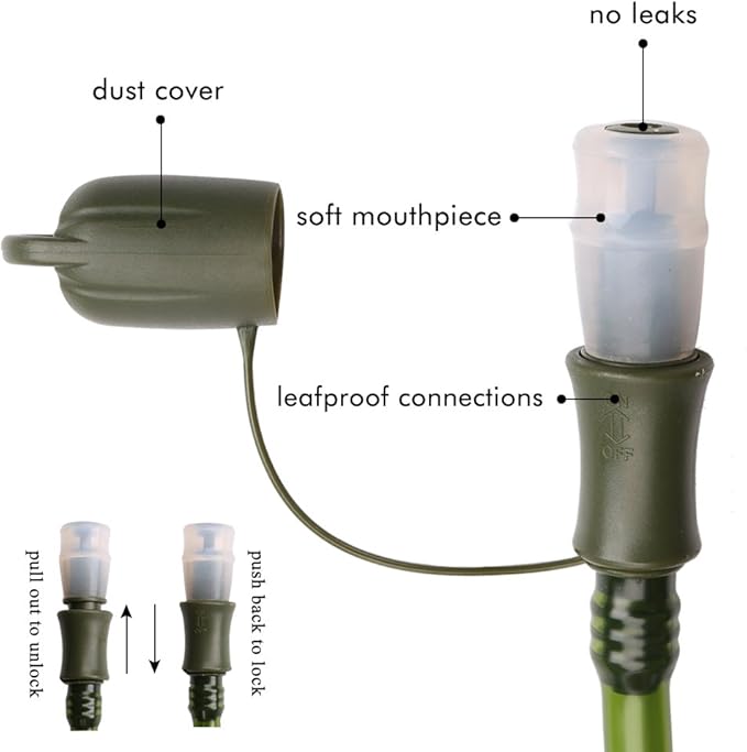 - Well-sealing water bladder: You won't be slowed down with the high flow bite-valve; simply bite the mouthpiece to suck water; soft mouthpiece with easily accessible ON/OFF valve; it also has a cover to keep dirt out; conveniently control the water flow by biting; quick-release tube is detachable; while the tube is removed, the connector automatically shut off and the hydration bladder will stay filled; store neatly in fridge/icebox without tangling hose
