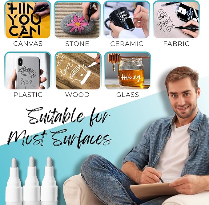 - ☑️ PAINT ON ANYTHING - Use our white black paint pens on stone, wood, glass, fabric, pottery, plastic, canvas, leather, cardboard, construction paper, ceramic, metal, cement, canvas, rubber, cloth, leather, terra-cotta, chalkboards--pretty much anything you can imagine!