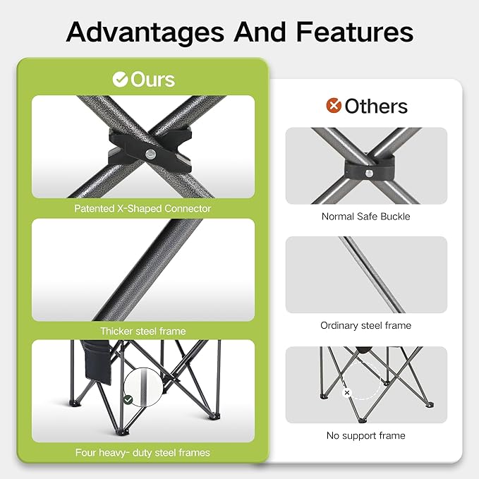 - 【CAMPING CHAIR With Premium Material】 The lawn chair with ergonomic padded back, seat and armrest provide max comfort for your body. The durable double-layer 600D padded oxford fabric with powder-coated steel tube frame enables you deserve a comfortable and safe chair