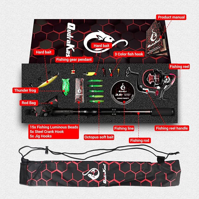 - đ ăFISHING ROD KITăThis is the perfect starter fishing kit for all types of angling. Includes 1 telescopic fishing rod, 1 fishing reel, 1 fishing pole bag, 1 fishing line and full fishing lures & accessories kits. They are also very lightweight, you can take these into your carry-on baggage.