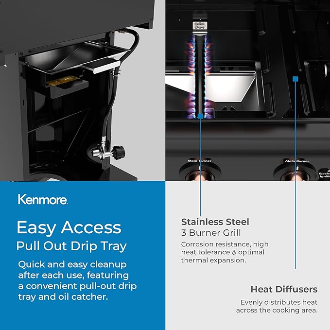 - 4 CASTER WHEELS FOR EASY MOBILITY – Who needs muscles when you've got wheels? The Kenmore 3-Burner Gas Grill comes equipped with 4 smooth-rolling wheels, 2 of which lock for added security and stability. No heavy lifting required! Take this grill on the go and lock it into place wherever you desire. Whether you're grilling up a storm on your backyard patio or taking it on the road to your next tailgate, this grill's got your back.