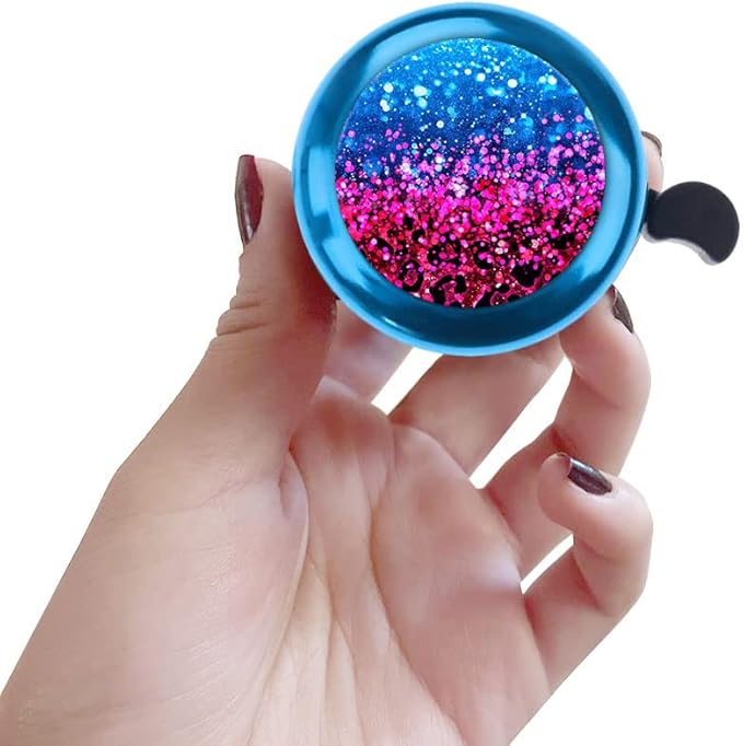 - PREMIUM MATERIAL: Our nice bicycle bells with stylish designs are made of high-quality aluminum material that is lightweight, strong, fashionable and durable. They are ideal for children's bikes, boys, girls and adults. The aluminum bike bell's diameter is about 2.12 inches (5.38 cm) that can be easily installed on the right or left side. NOTE: IT DOES NOT HAVE REAL GLITTER, JUST A PRINT OF GLITTER WITH SHINY BLING LOOK.