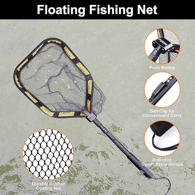PLUSINNO Floating Fishing Net for Steelhead, Salmon, Fly, Kayak, Catfish, Bass, Trout Fishing, Rubber Coated Landing Net for Easy Catch & Release, Compact & Foldable for Easy Transportation & Storage