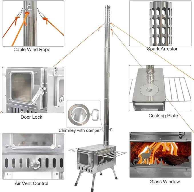 - Wide Application: The tent wood stove is designed for the outdoor world whether you are camping, tent heating, hunting, fishing, cooking, boiler water, etc. the wood-burning stove can provide you with full warmth in the cold winter