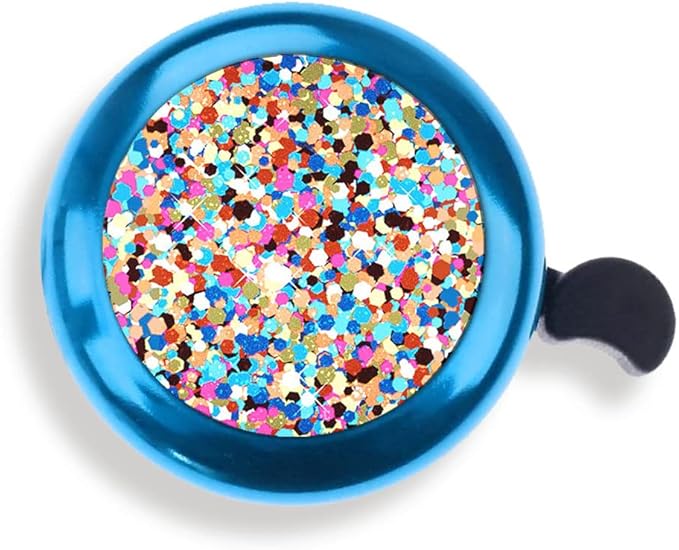 - PREMIUM MATERIAL: Our nice bicycle bells with stylish designs are made of high-quality aluminum material that is lightweight, strong, fashionable and durable. They are ideal for children's bikes, boys, girls and adults. The aluminum bike bell's diameter is about 2.12 inches (5.38 cm) that can be easily installed on the right or left side. NOTE: IT DOES NOT HAVE REAL GLITTER, JUST A PRINT OF GLITTER WITH SHINY BLING LOOK.
