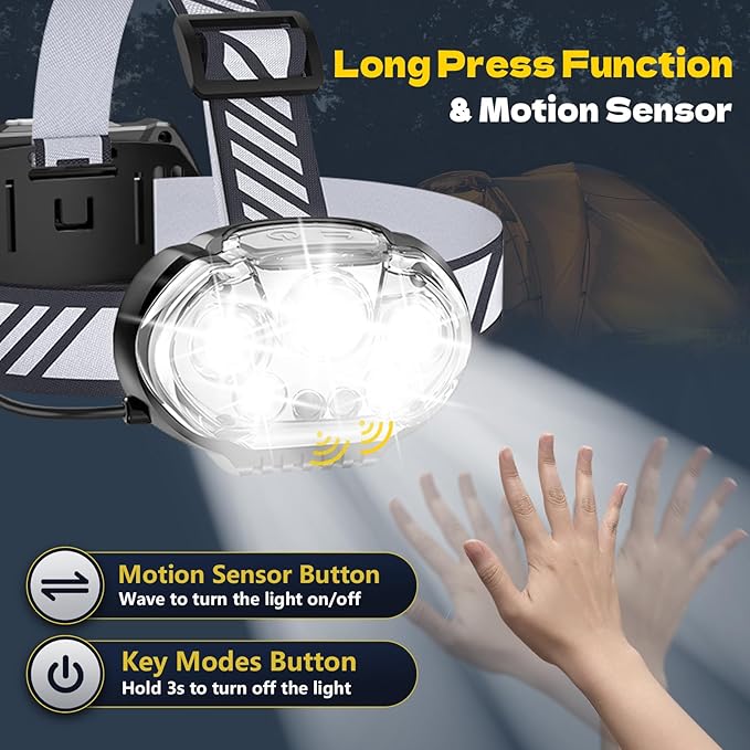 - Long Press and Motion Sensor: In any mode, press the on switch button for 3 seconds, the rechargeable headlamp flashlight will turn off directly, no need to cycle through all the modes. The headlights for head is also equipped with the smart motion sensor, which easily controls the headlamps for adults on and off with a wave of your hand, more convenient for your work