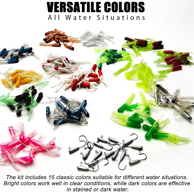 - 【165PCS Crappie Lures Tube Baits Jig Head Kit】VMSIXVM crappie bait and jig heads kit include 150pcs crappie baits with 15 classic color suitable freshwater saltwater and 15pcs tube jigs. Each tube crappie bait and lure is 2.2", each tube jig head is 1/16oz. Guaranteed to be the most effective soft plastic fishing lures you will ever use!