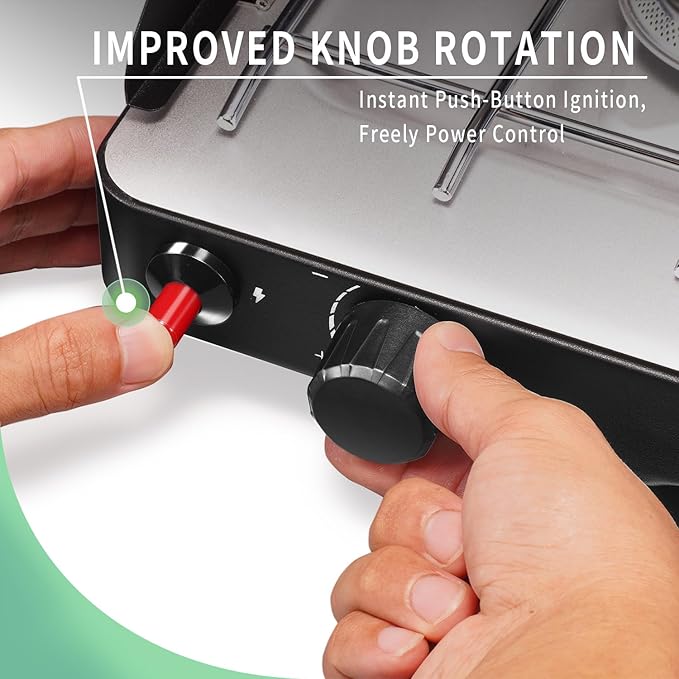 - IMPROVED COOKING CONTROL: Each burner is controled independly by improved knob rotation for precise temperature adjustment. Our spacious burner fits a 12-inch and 10-inch pan at the same time. PLEASE TURN ON THE KNOB FIRST BEFORE START TO IGNITION